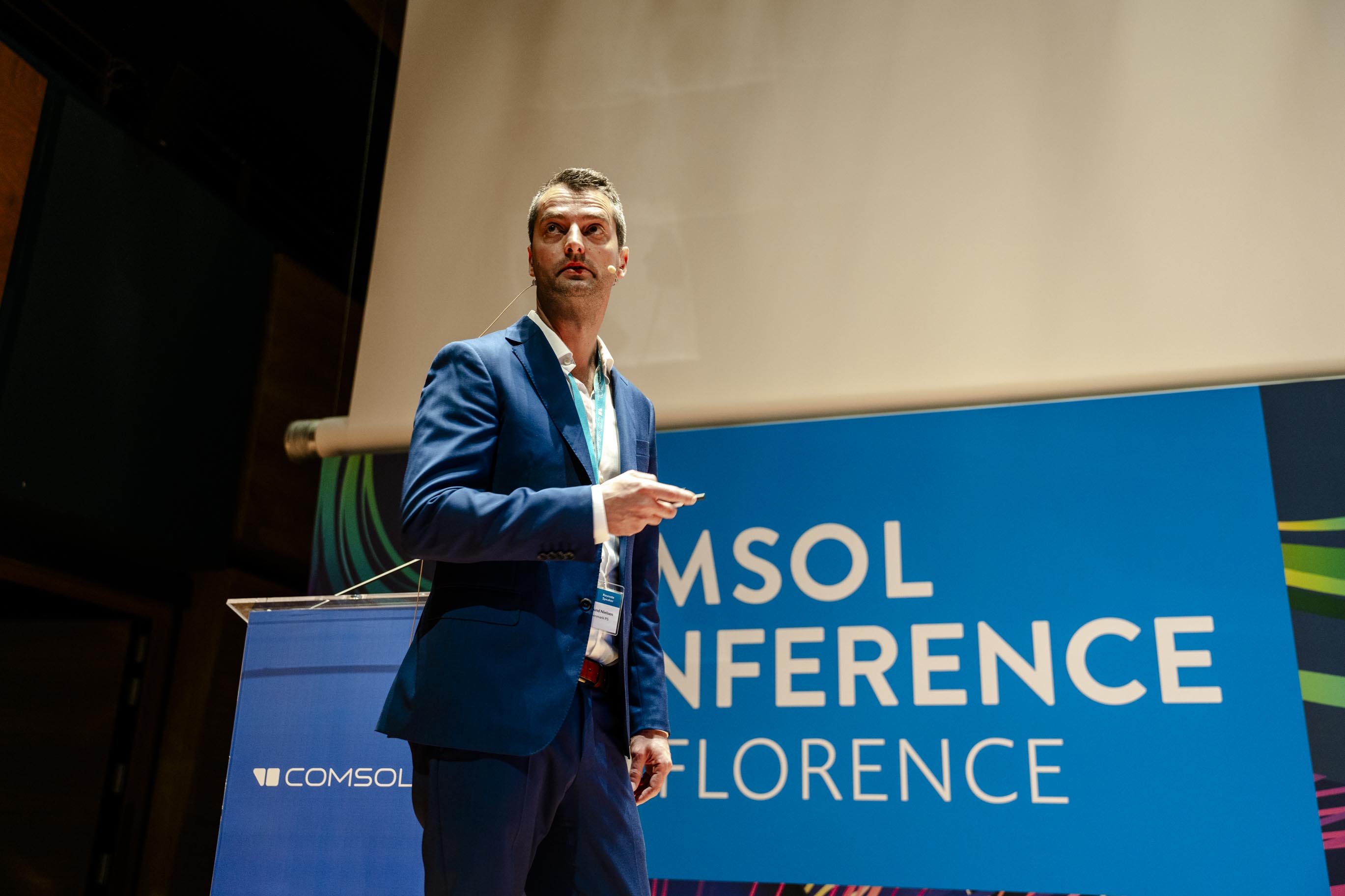 Another highlight of the COMSOL Conference 2024 Florence was the invited talk sessions, which were dedicated to specific industries and areas of physics and featured presentations by invited authors. During these sessions, four speakers each delivered 10-minute slideshow presentations on how they are using modeling and simulation. With a total of 48 invited talks, attendees were able to see how simulation is being used for applications such as noise attenuation, machine learning, and spacecraft device development, to name just a few.