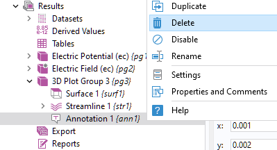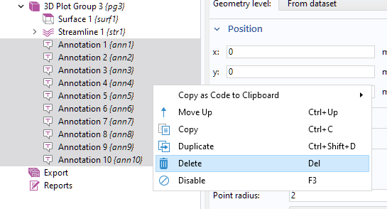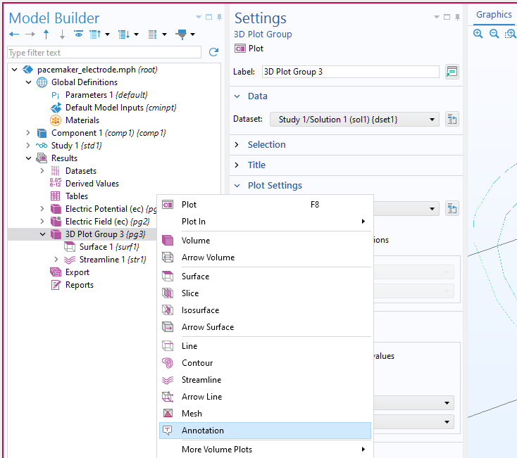In the model tree, right-click 3D Plot Group 3 and select Annotation.