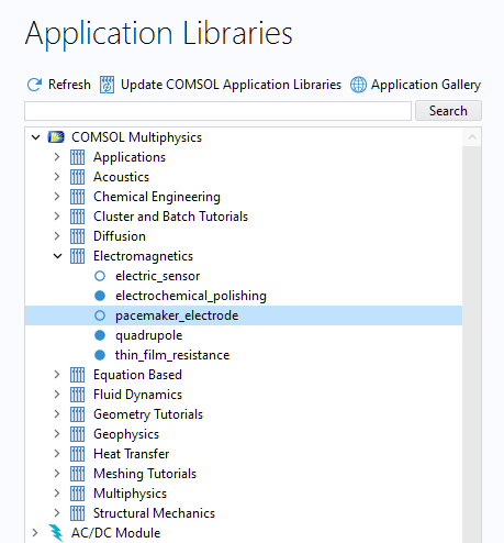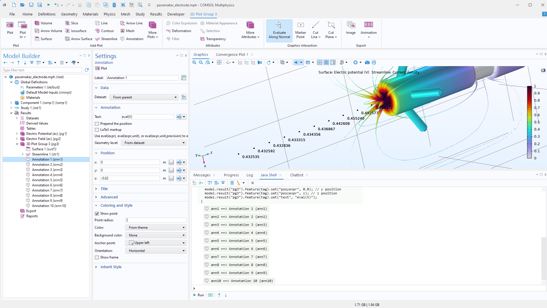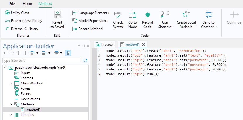 The AI model that the chatbot functionality communicates with does not understand all aspects of the COMSOL API. However, by using the Record Code or Record Method functionality in the Application Builder, we can guide it to produce useful code suggestions. In the following example, you will learn how to add annotations to a model and then build on this by asking the Chatbot window for help. To get started, open the Pacemaker Electrode tutorial model from the Application Libraries, under COMSOL Multiphysics > Electromagnetics.