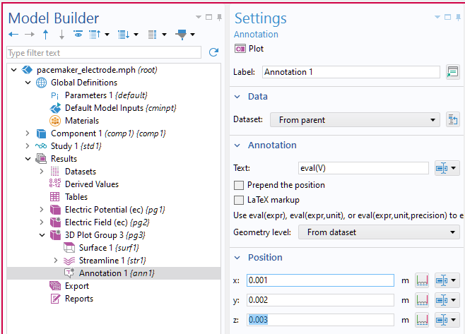 In the Settings window for the Annotation node, in the Text field, type eval(V). This will evaluate and display the local value of the electric potential field. Next, for the Position settings, enter 0.001, 0.002, 0.003 for the x-, y-, and z-coordinates, respectively.