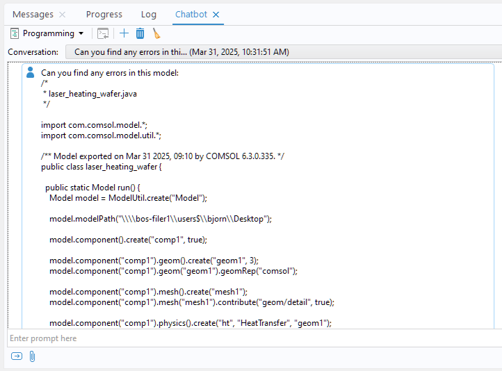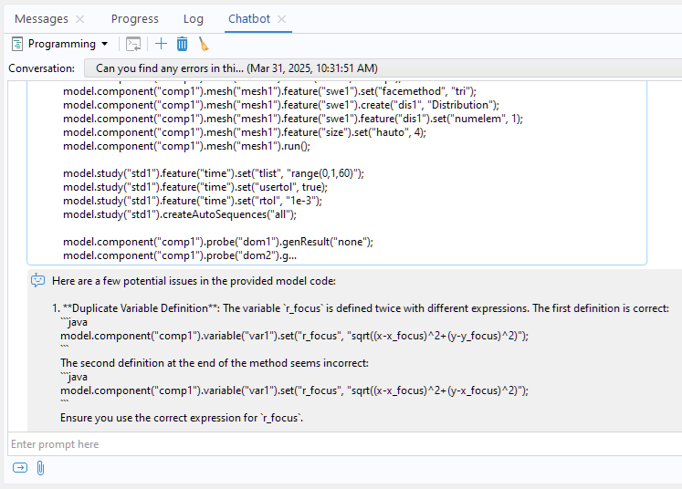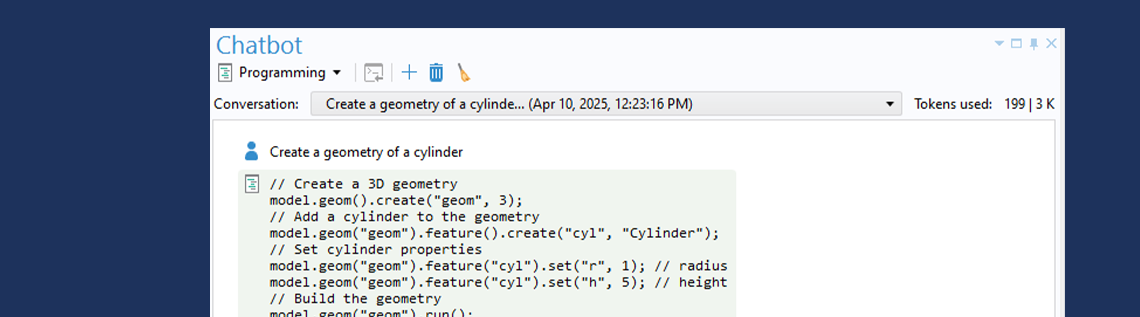 When building multiphysics models and simulation apps, the COMSOL API lets you write code to automate workflows, add custom functionality to your apps, and integrate with external tools. The Chatbot window functionality introduced in COMSOL Multiphysics® version 6.3 connects you directly to OpenAI™ GPT models, allowing you to generate or debug COMSOL API code. For example, it can help convert repetitive tasks into for loops or locate logic errors in a method. You can also use the Chatbot window to query for general modeling advice.