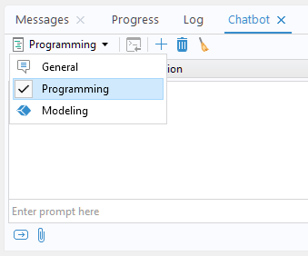 In the Chatbot window, there are three chat subject options: General, Programming, and Modeling. For this example, select Programming.