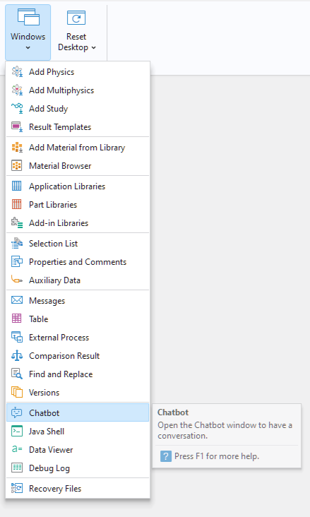 The Chatbot window is available for the Windows® version of COMSOL Multiphysics®. It is included in the platform product but is not installed by default. (Instructions on how to install and set up the Chatbot window can be found in this Learning Center article.)