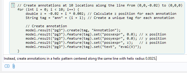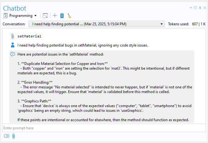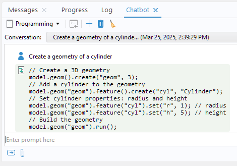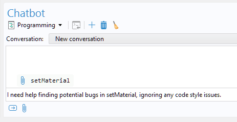 The Chatbot window has been primed for convenient use within COMSOL Multiphysics®, providing information specific to modeling and simulation and eliminating the need to copy-paste messages to and from external AI tools. Instead, you can easily attach methods to have them checked for bugs or run API code suggested by the AI model, with results immediately visible in the Model Builder and the Graphics window.