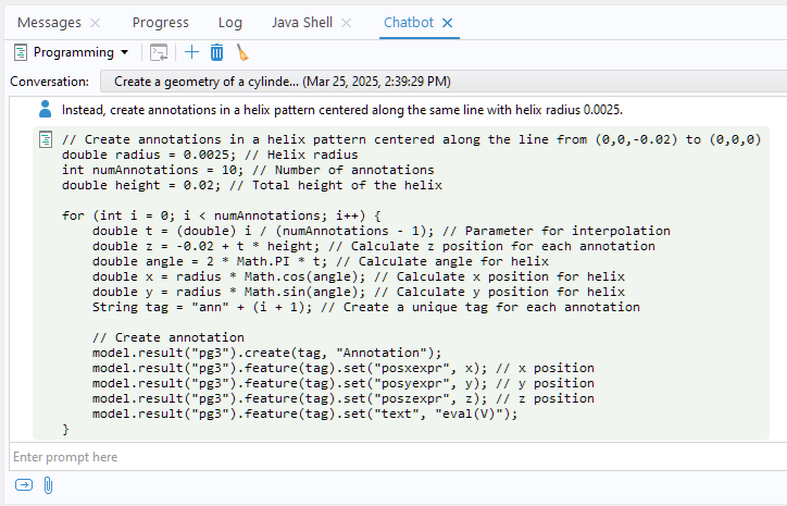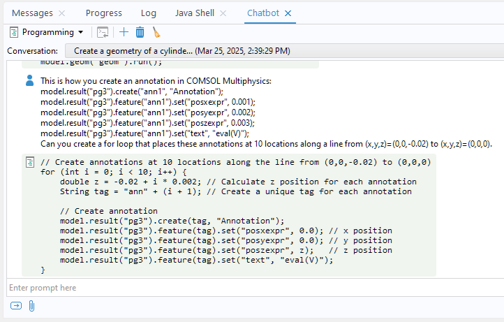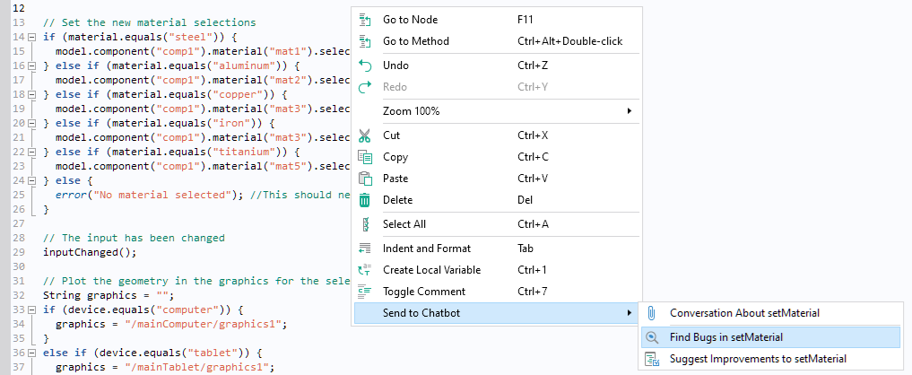 Some basic knowledge of Java can be helpful when working with the COMSOL API; however, this is often not necessary when using the Chatbot window, as it includes functionality that assists with Java syntax and code structure.