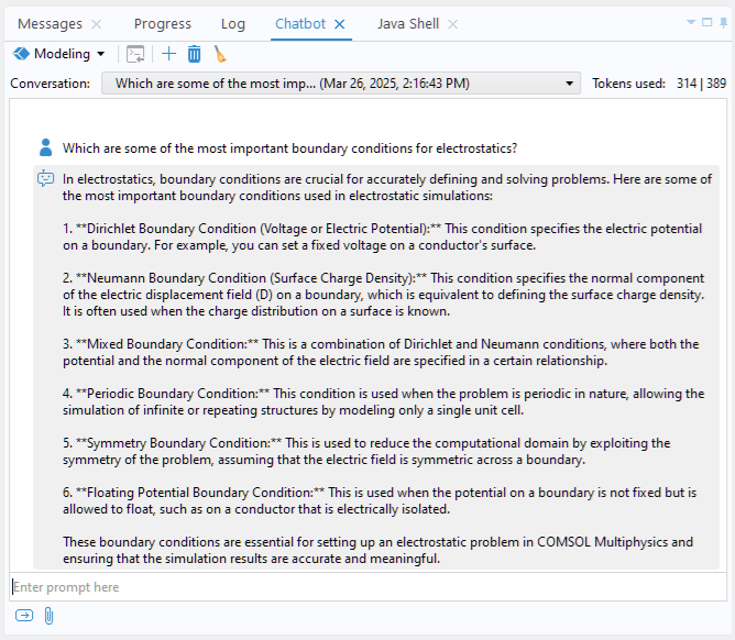You can also ask for modeling tips in the Chatbot window. Let’s say we are new to the area of electrostatics modeling and that we are interested in which boundary conditions are important for such models. For this purpose, in the Chatbot window, select the Modeling subject option. Enter the prompt: