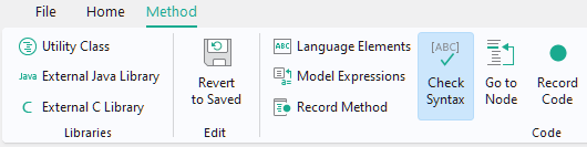To find syntax errors, you can click the Check Syntax button on the Method tab. This functionality does not utilize the Chatbot window but is a compiler-level check; using the built-in Java compiler, the Method Editor automatically compiles a method when, for example, you leave a window or save your app or model.