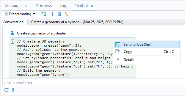 The Java Shell window, also introduced in version 6.3, provides a command prompt for running Java code interactively. You can use the Java Shell window to run code generated in the Chatbot window. We will show you how to do this in the examples below.