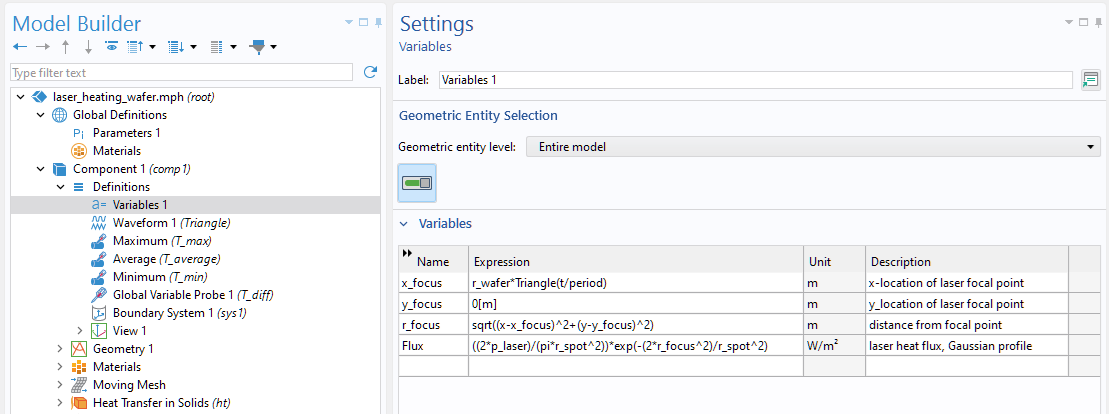 To try this out, open the Laser Heating of a Silicon Wafer tutorial model from the Application Libraries under COMSOL Multiphysics > Heat Transfer. This model, which demonstrates a transient simulation of a laser moving over a silicon wafer, does not require any add-on products.